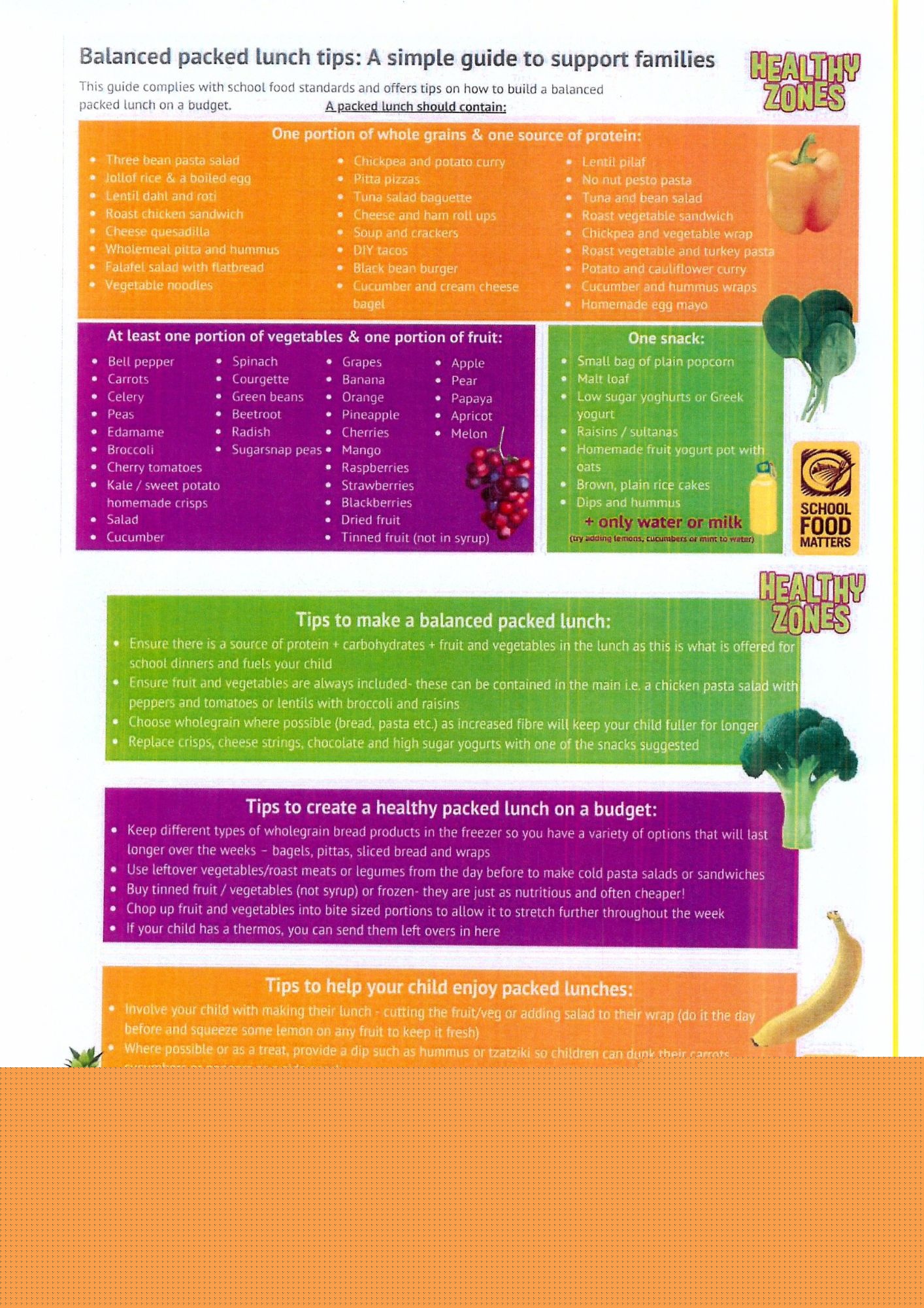 Good nutrition in childhood can help to prevent a variety of health problems, both in the short term and later in life. There is increasing concern and scientific evidence that many children are consuming too much fat, sugar and salt and too little fibre, fruit and vegetables. Packed lunches can contribute to almost a third of a child’s weekly food intake and therefore need to be balanced and nutritious. Please find attached a simple guide to support families in providing a balanced packed lunch for their child.