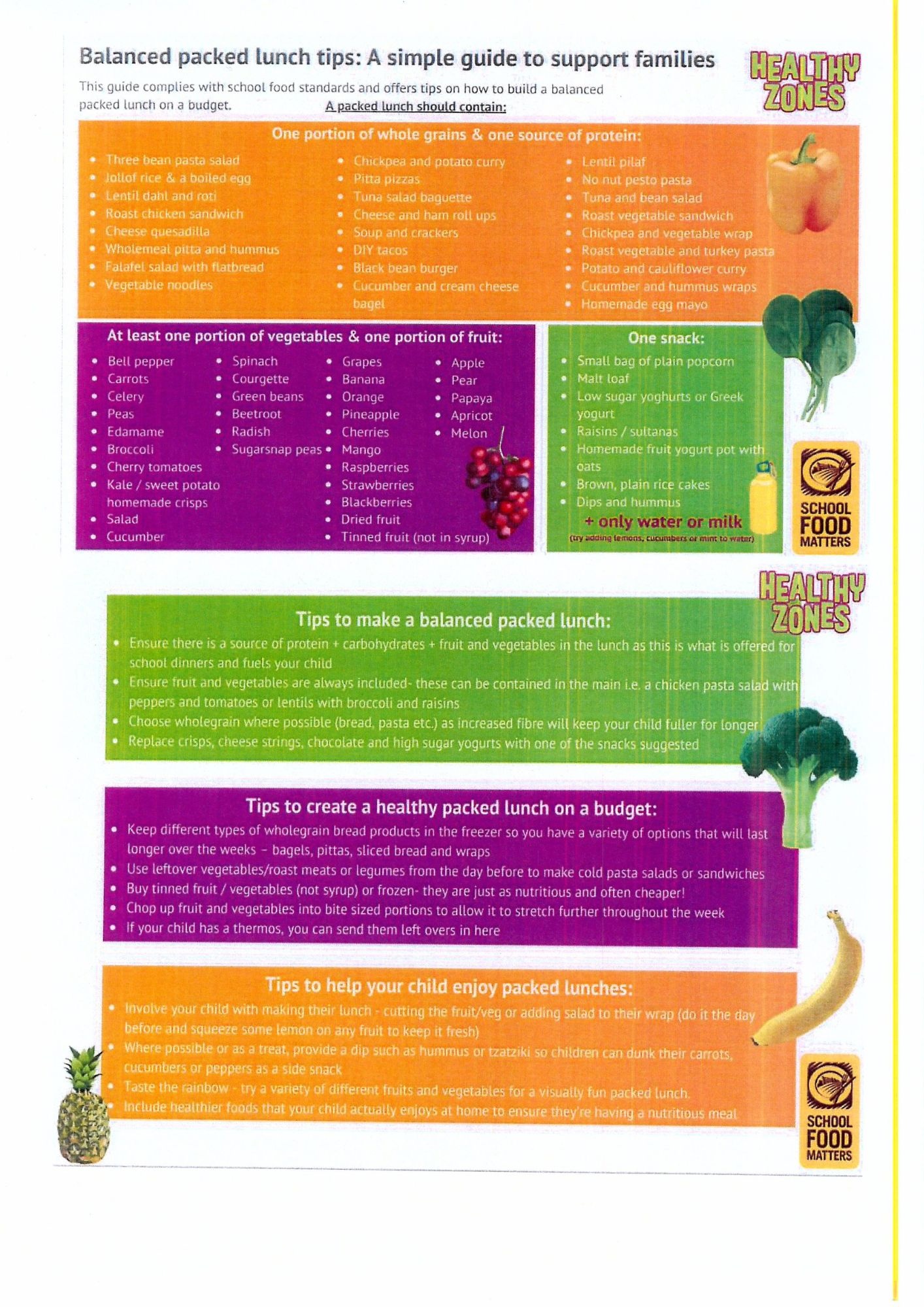 Good nutrition in childhood can help to prevent a variety of health problems, both in the short term and later in life. There is increasing concern and scientific evidence that many children are consuming too much fat, sugar and salt and too little fibre, fruit and vegetables. Packed lunches can contribute to almost a third of a child’s weekly food intake and therefore need to be balanced and nutritious. Please find attached a simple guide to support families in providing a balanced packed lunch for their child.